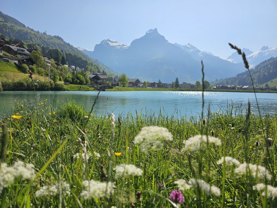 간식을 먹고 호수 근방의 길로 내려왔습니다. 호수쪽에서 바라본 티틀리스 산입니다. 사진에는 그냥 산 사진처럼 보이지만 직접 앞에서 섰을 때의 웅장함은 직접봐야 느낄 수 있는 것 같습니다.