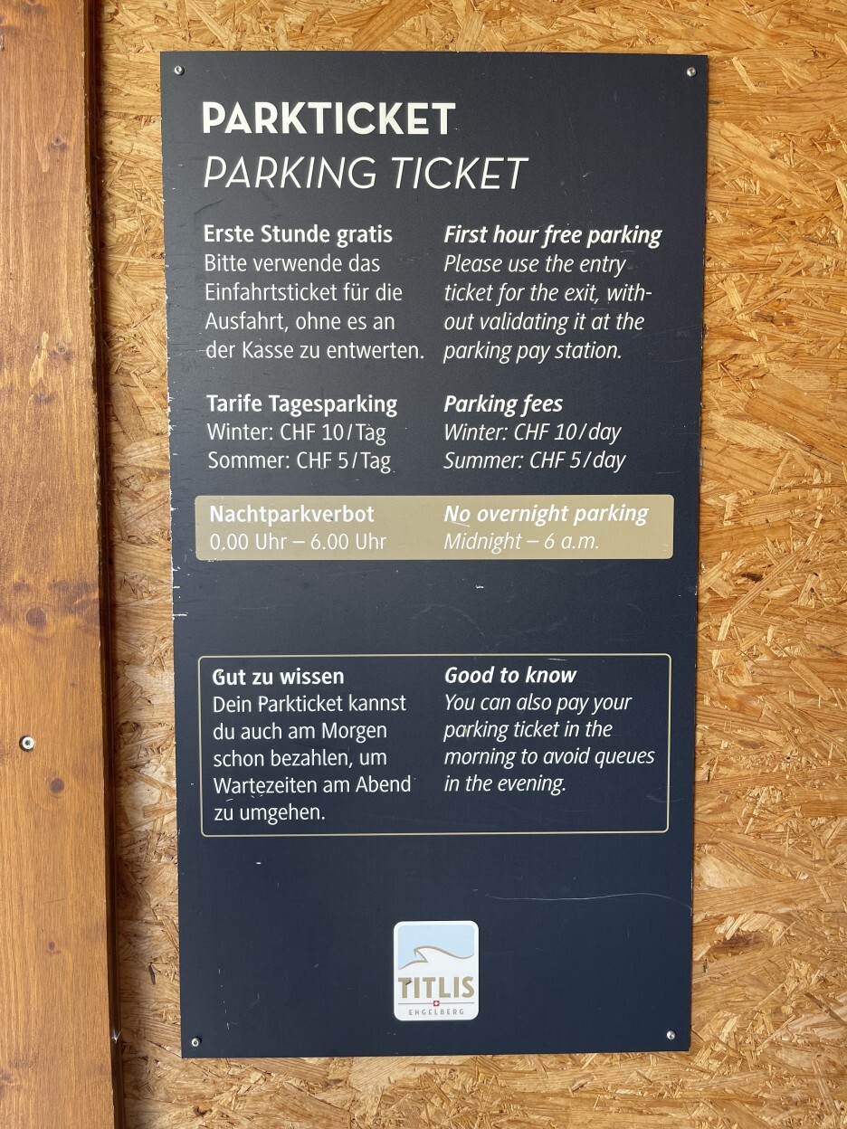 티틀리스 주차장은 하절기와 동절기로 요금이 구분되는데 하절기는 하루 5프랑, 동절기에느 하루 10프랑입니다 아무래도 동절기에 겨울 스포츠를 즐기시는 분들이 꽤 많이 방문하고 오래 있을 것 같다는 생각이 듭니다.