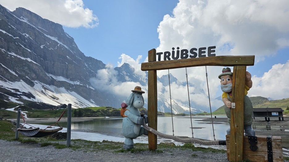 트레킹도 가능한지 걸어서 오르는 사람들도 하나, 둘 있습니다. 리프트 뒤쪽으로 트륍지 호수(Trübsee)가 보입니다. 호수 옆에는 식당과 호텔이 있습니다.