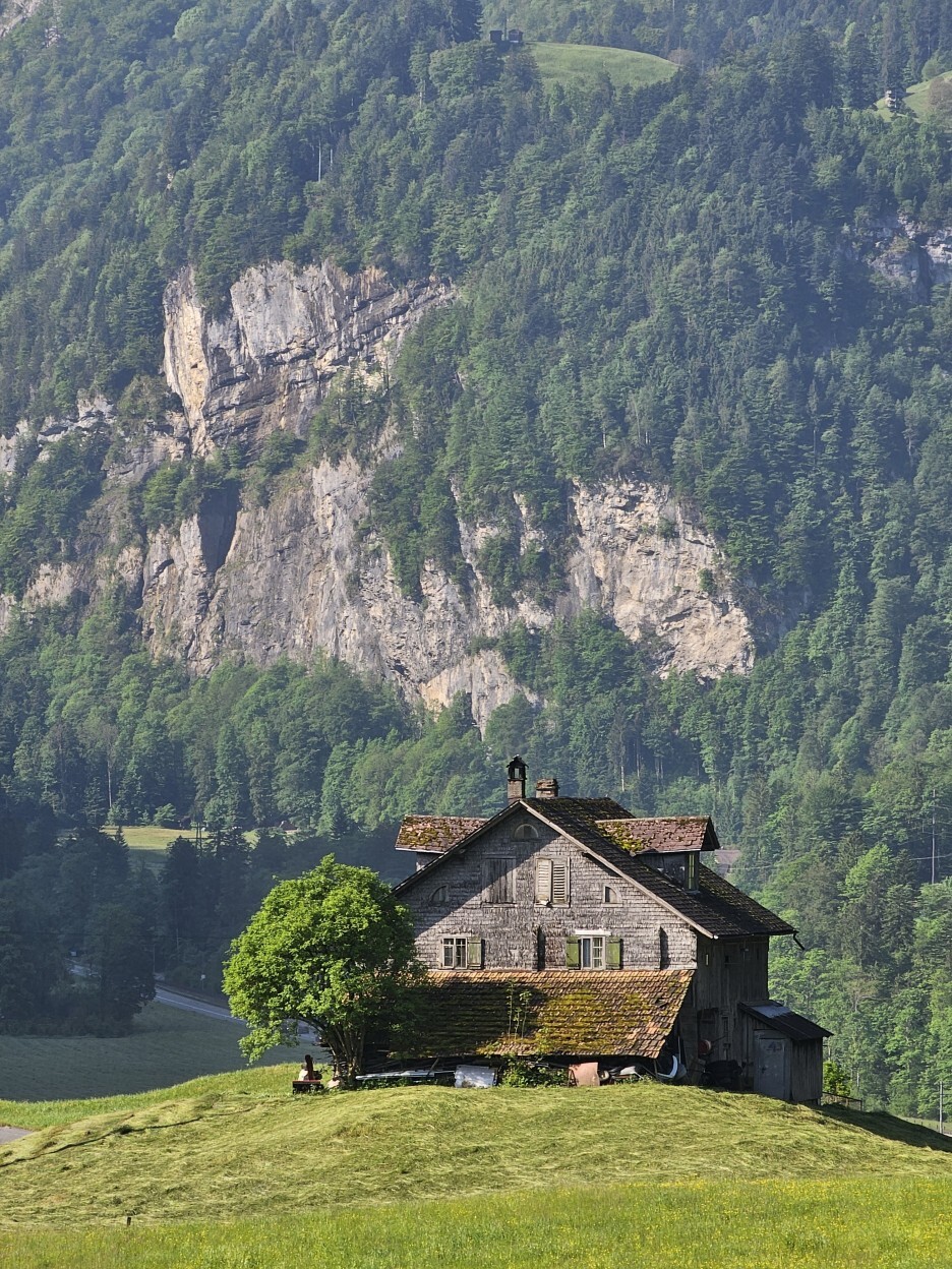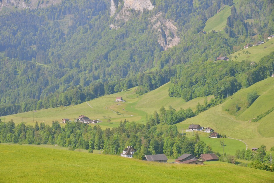 루체른 호수를 아래쪽으로 돌아서 골짜기로 가야하기 때문에 숙소에서는 생각보다 시간(1시간 정도)이 걸립니다. 아침에 산을 넘어서 들어오는 햇살은 부드럽기도 하고 적당히 그림자가 생기기 때문에 풍경사진의 입체감을 더해 줍니다. 티틀리스로 가는 길의 도로 주변의 마을도 아름답습니다.