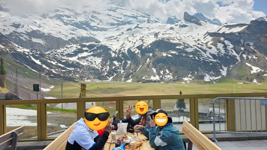 바깥 테이블에 자리를 잡고 간식을 먹어봅니다. 아래쪽에서 바라보는 티틀리스도 멋집니다.