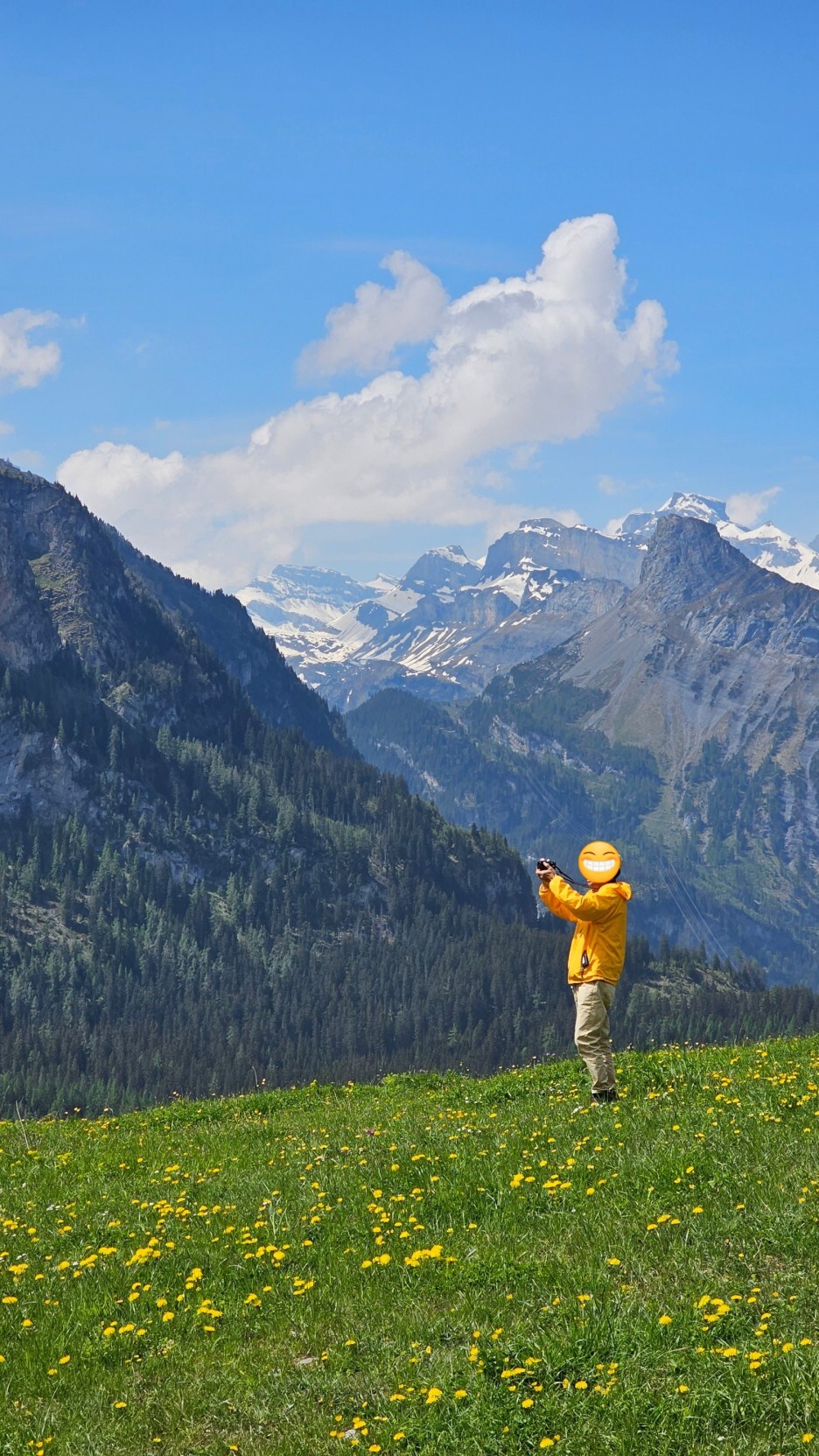 여기도 날씨가 풍경의 전부를 좌우합니다. 골짜기 건너로 보이는 높은 산과 만년설, 초록초록한 들판과 노란 민들레가 조화롭게 펼쳐진 풍경입니다.