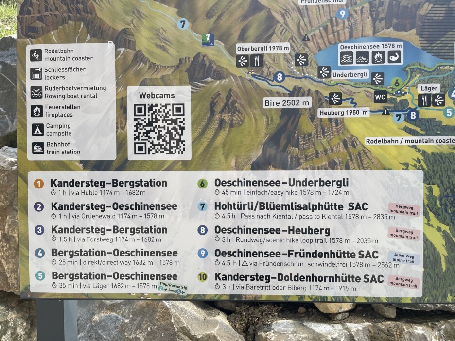 정상에 오르면 외쉬넨호수의 관광관련 안내표지판이 있습니다. 우측상단의 QR코드를 찍으면 핸드폰으로 손쉽게 지도를 볼 수 있습니다. 좌측하단에는 트레킹, 하이킹 코스와 시간이 나와있어서 둘러보기에 너무 좋습니다.